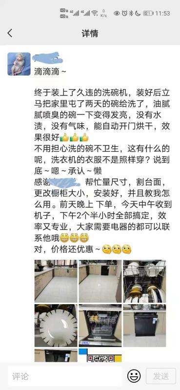 安装结束后,周女士马上把满是油污的碗筷放入洗碗机体验效果,洗后餐具光亮如新,而且没有气味,这让她十分满意,当即在朋友圈发文对海尔洗碗机的产品与服务大加赞赏。