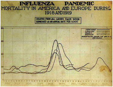 这场全球性的流感所造成的灾难是可怕的,第一次世界大战死于战场的人才不过1000多万人,然而临近结束,这场流感却死亡接近5000万人,是战争阵亡总人数的将近5倍!尤其可怕的是,这场流感死亡者的年龄分布呈“W”型,最多的死者是70岁以上老年人,20-40岁的青壮年,以及5岁以下儿童,其中,又以青壮年所占死亡比率最多。一场死亡人数5000多万的浩劫,带走了无数青壮年的生命,这多么可怕!