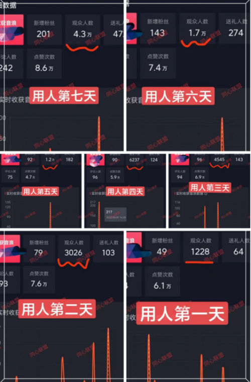 一位服装主播新人,对接同心联盟合作三天后,直播人数呈直线式上升态势,提升效果明显,各项数据均突破新高,充分证明了同心联盟直播间真人互动的出色效果。直播间真人人气互动,以专业➕诚信的服务,做好直播间的各项数据,带动直播间的羊群效应,用人工干预撬动自然流量,帮助你的直播间快速起飞,最终促成直播间的成交转化,带来更多的直播变现。